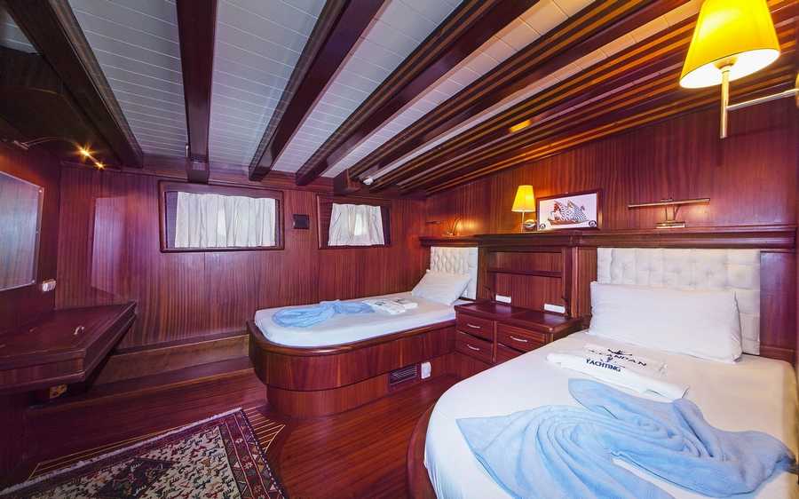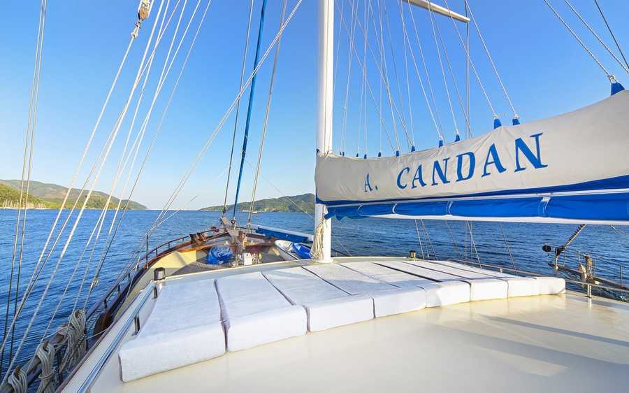 A Candan è un caicco dai grandi spazi che offre un ottimo livello di servizio. Può accogliere fino a 16 ospiti in 2 cabine master, 4 matrimoniali e 2 doppie con bagno privato. Alloggi separati per i 5 membri dell’equipaggio. Adatto a gruppi numerosi che amino i grandi spazi offre un ottimo servizio. La barca è omologata fino a 16 ospiti anche in acque greche. La presente scheda non ha finalità contrattuali.
