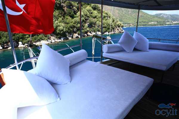 Junior Orcun è uno dei pochi caicchi 8 cabine che offra un ottimo livello di servizio. Varato nel 2007 ha subito un profondo refit per la stagione 2014. Puo accogliere fino a 16 ospiti in 6 cabine matrimoniali e 2 doppie. La presente scheda non ha finalità contrattuali.