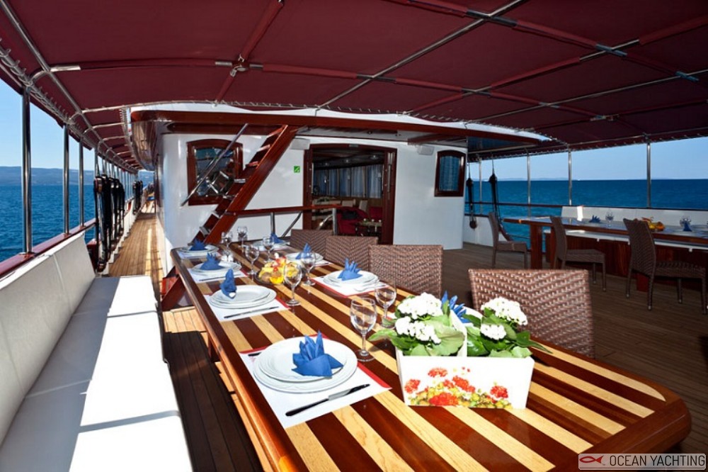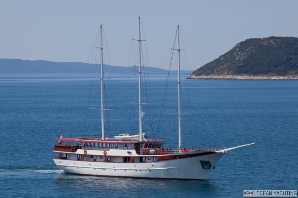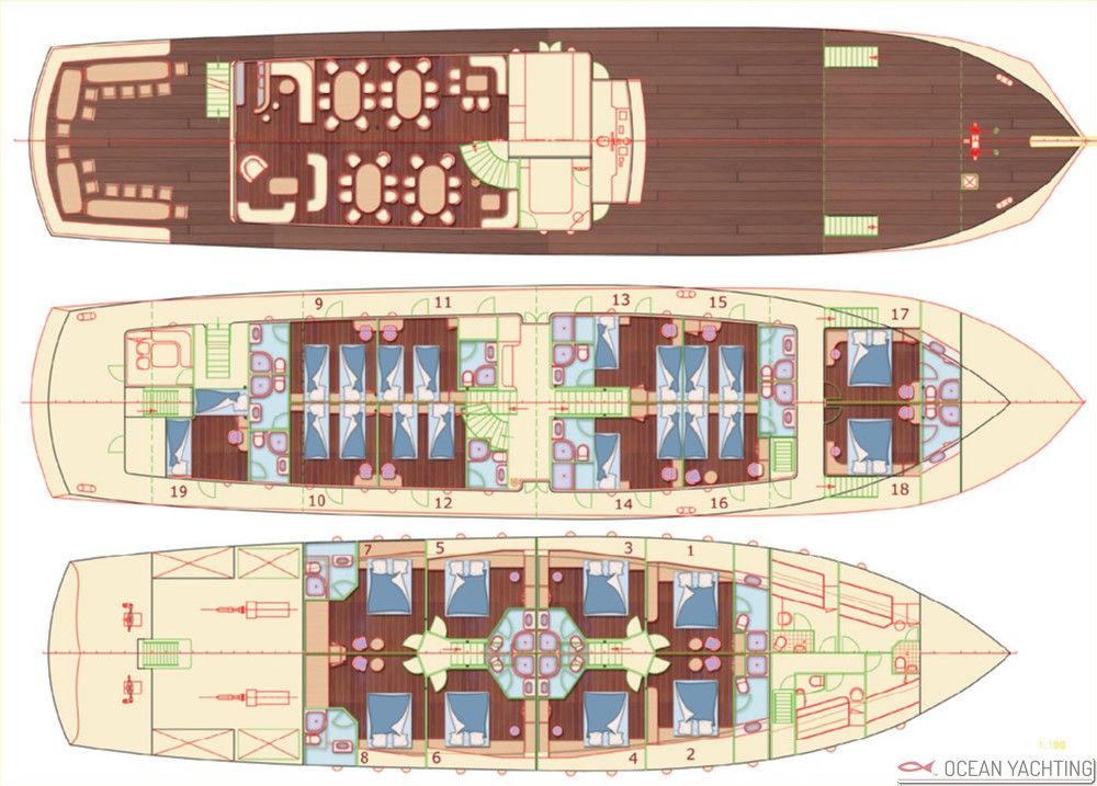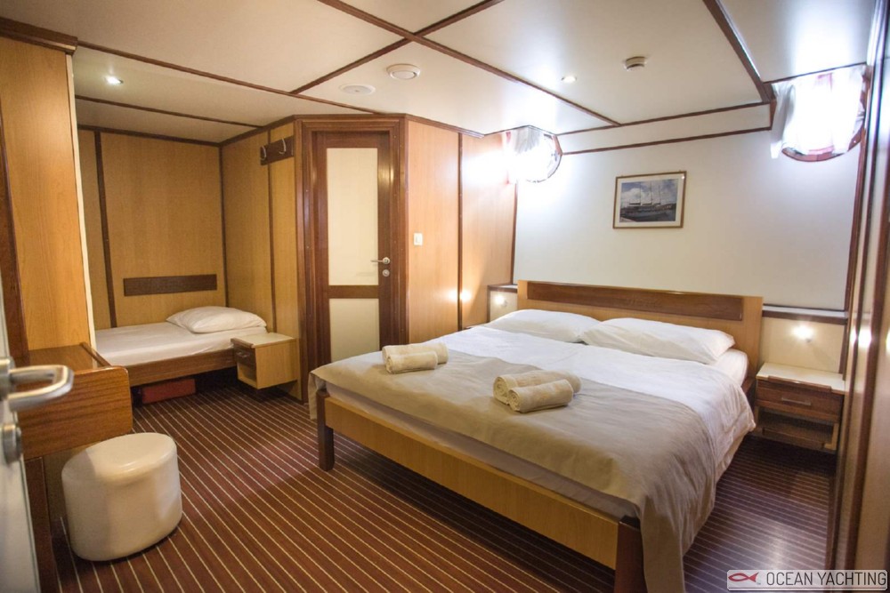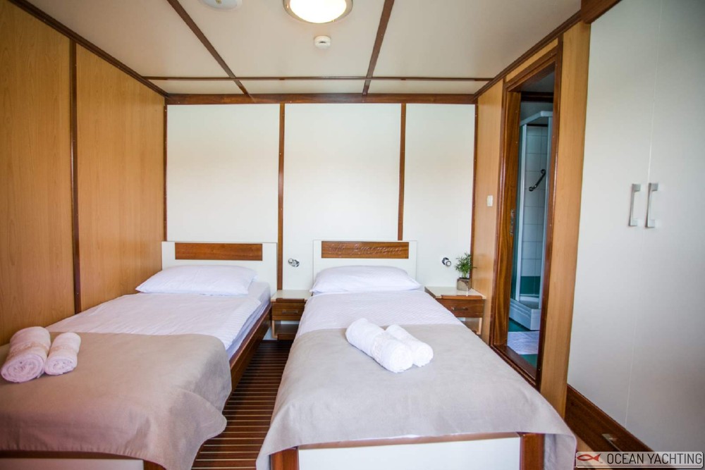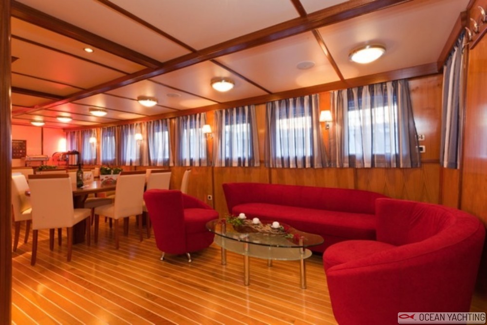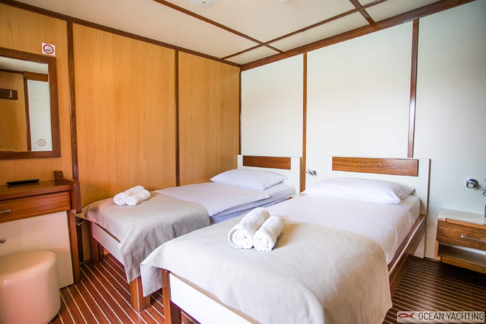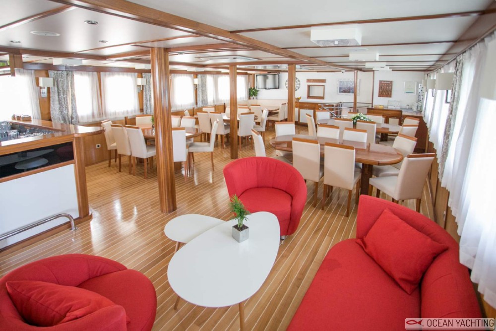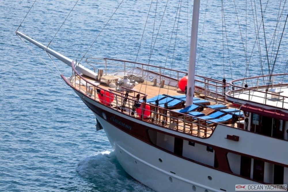 Amorena è un minicruiser che può accogliere fino a 40 ospiti in cabine molto spaziose (da 9 a 20 mq) distribuite su 2 ponti. Il ponte superiore accoglie una zona bar di 65 mq e un solarium sul fly di ben 220 mq. 7 persone d’equipaggio per offrire una crociera molto confortevole. La presente scheda non ha finalità contrattuali.