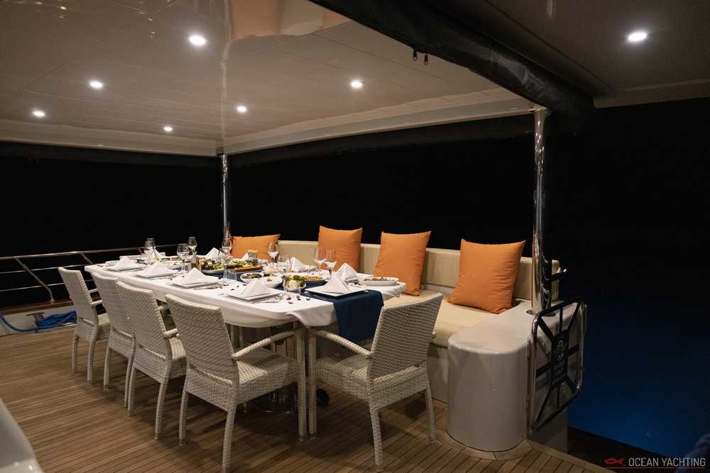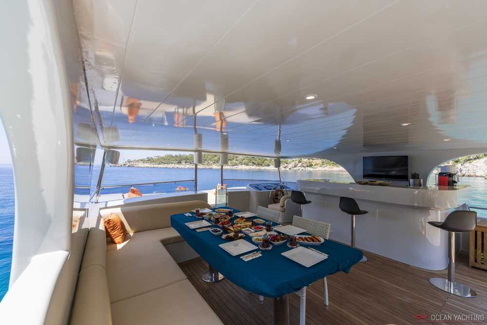 Simay S è il gemello di altri Simay, trawler di grande successo. La visita alla barca è stata una piacevole sorpresa. Cabine comodissime, interni di pregio, grande spazio nel fly, dotato di bar e spazio solarium a prua. Può accogliere fino a 10 ospiti in 2 master, 1 matrimoniale e 2 twin, con 5 persone di equipaggio. La presente scheda non ha finalità contrattuali.