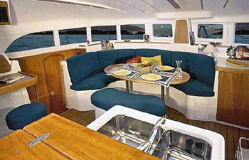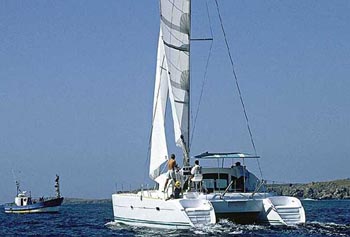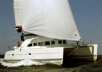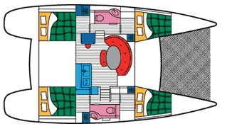 Catamarano 3-4 cabine 2 bagni. Le due cabinette di prua, se presenti, non possono accogliere che dei bambini. Esiste con versione hard top che bimini classico. La presente scheda non ha finalità contrattuali e rappresenta la tipologia di imbarcazione proposta, non la barca specifica del preventivo.