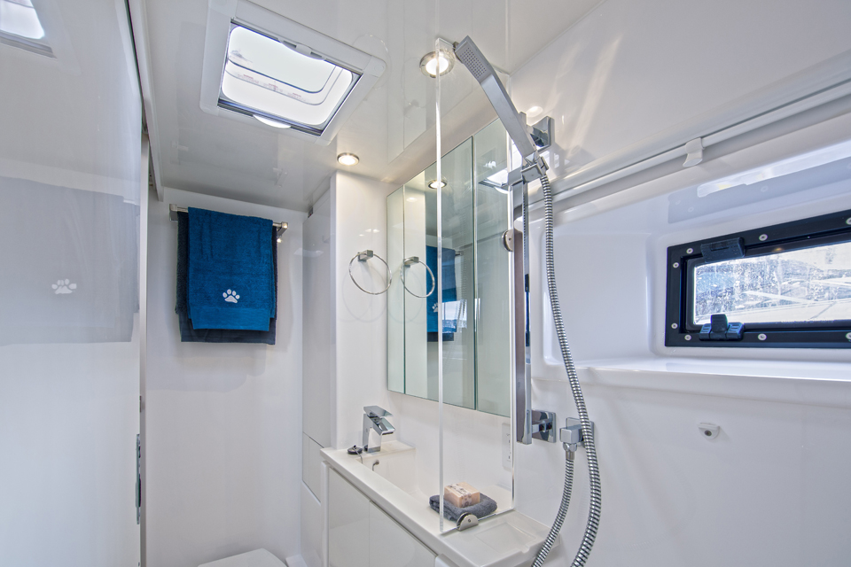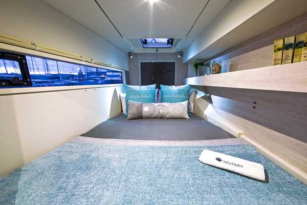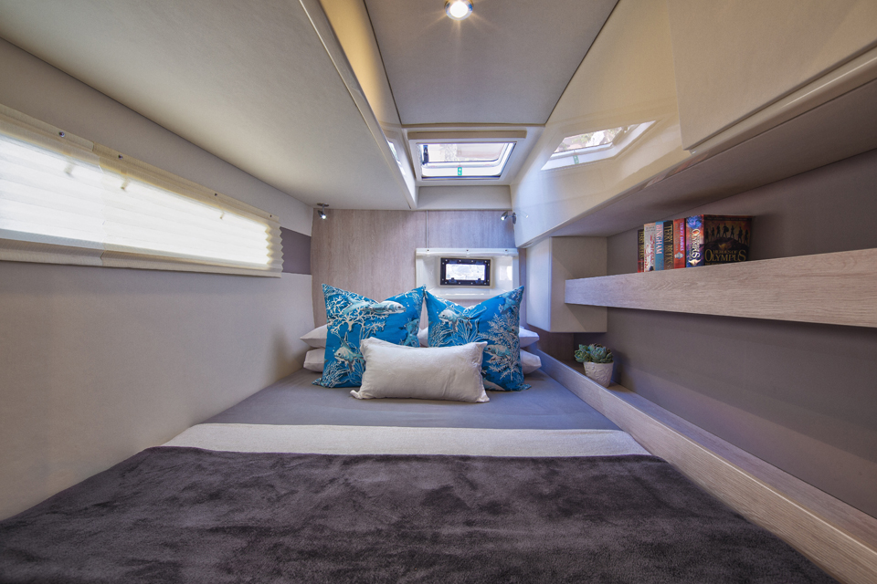 Catamarano di nuova generazione, dalle linee moderne e legni chiari, dispone di 4 cabine matrimoniali e 2 cabinette di prua con accesso dalla cabina, adatte per bambini. La caratteristica più saliente è il pozzettino di prua con accesso dal salone. 2 wc. La presente scheda non ha finalità contrattuali e rappresenta la tipologia di imbarcazione proposta, non la barca specifica del preventivo.