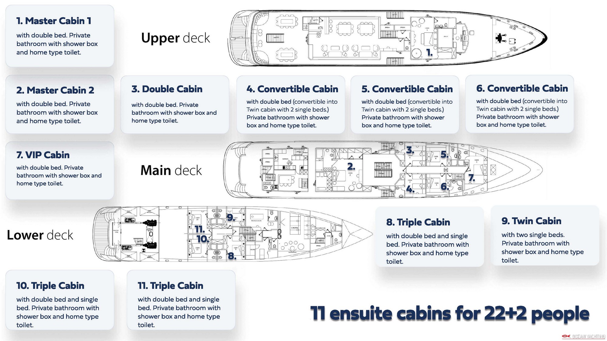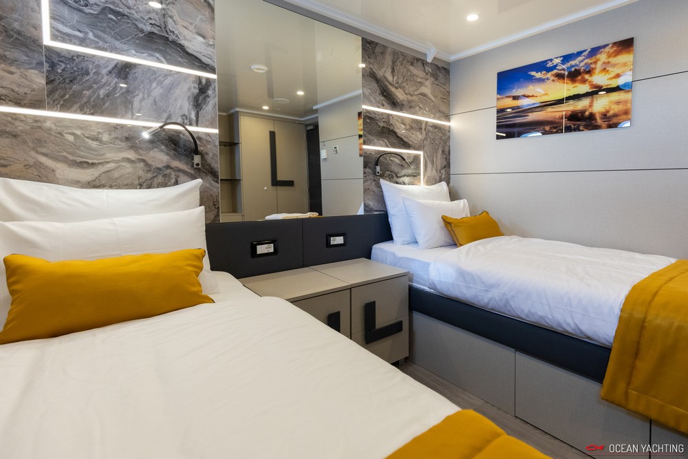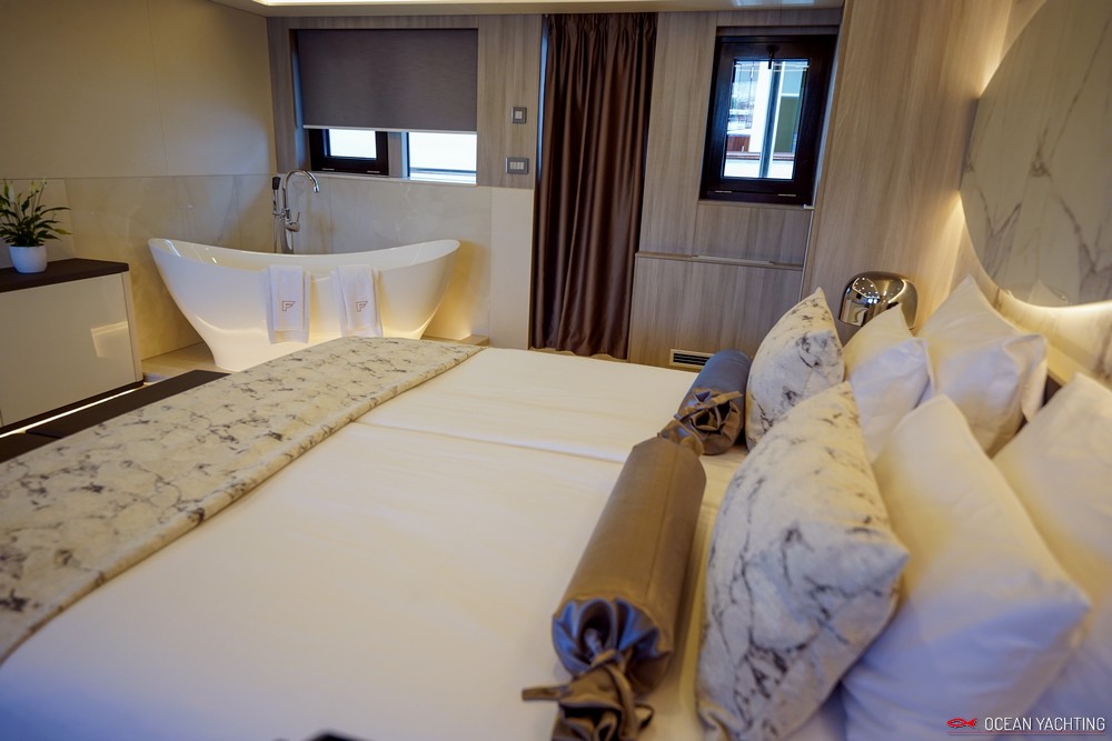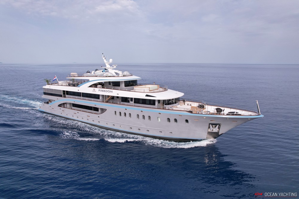 La nuova frontiera del lusso per grandi gruppi. Freedom può accogliere ingfatti fino a 24 ospiti in 11 cabine. Disponibile in Croazia. 11 persone di equipaggio. Tantissimi water toys disponibili, ma anche grandi zone prendisole e relax inclusi idromassaggio in coperta, sala cinema, sauna, palestra e sala massaggi. Prezzi da €100.000 a €130.000 a settimana. La presente scheda non ha finalità contrattuali.